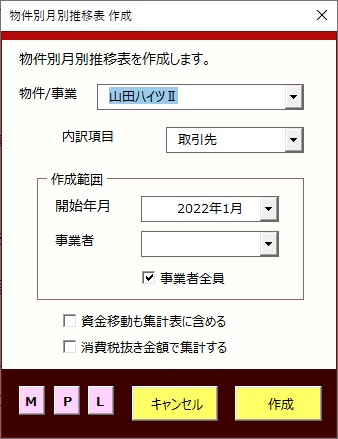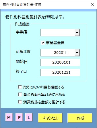 この項では、上記の代表例として 2-2)「物件/事業別科目別集計表」と、それから