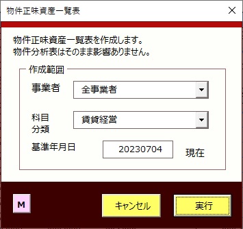 メニュー画面で[物件正味資産一覧表]を選択すると、下図の操作画面が表示されます。