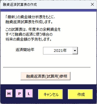 返済開始年度を指定し[作成]ボタンをクリックすると、融資返済試算表を作成します。