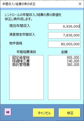 この画面は、作成された「年間収入/経費の表」の内容を修正します。