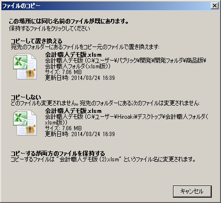 下段の「コピーするが両方のファイルを保持する」をクリックすると別の名称で記録されます。